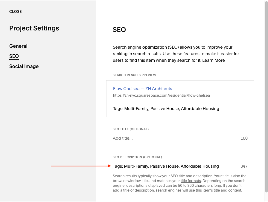 2. In project page Settings, click on SEO, and in SEO Description, update the tags to the same ones that are in the code on the project page.