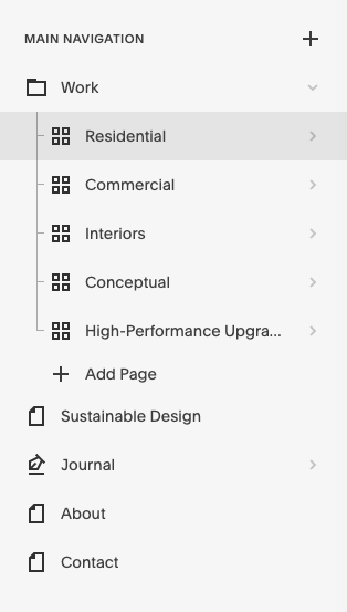 Anything with an arrow has subsequent pages within it. (Ex. Work, Residential, Journal)