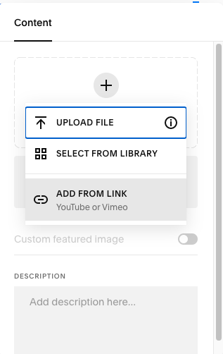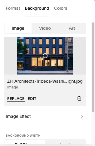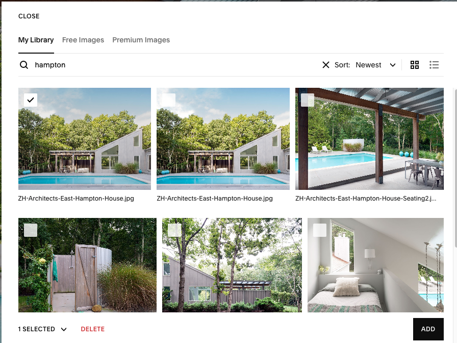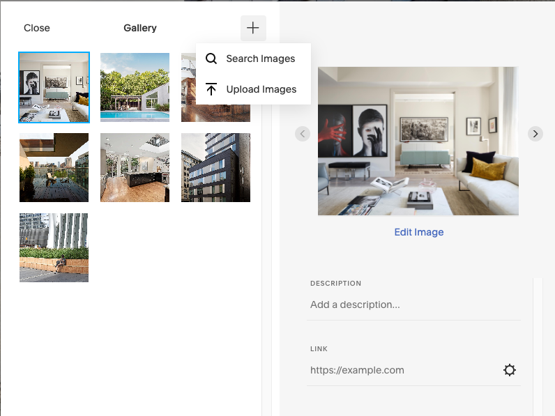 Select from Library/Search Images: Use an image that’s already been uploaded to the site. Squarespace keeps them in a library. A single image can be used in different instances, at differentt sizes and crops, without needing to resize or upload again for each instance.