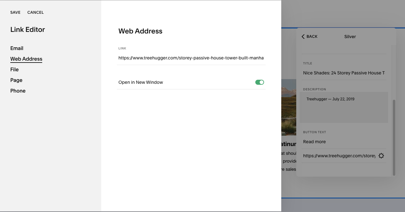 To link to an article, it’s better for the link to open a new window, so that your website stays open. To do this, click on the cog icon > click Web Address > enter the article link > click the toggle for “Open in New Window”, then click Save in the upper left corner.