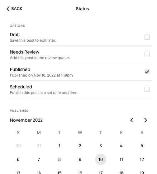 • Status (draft or published- change date to change the sequence)