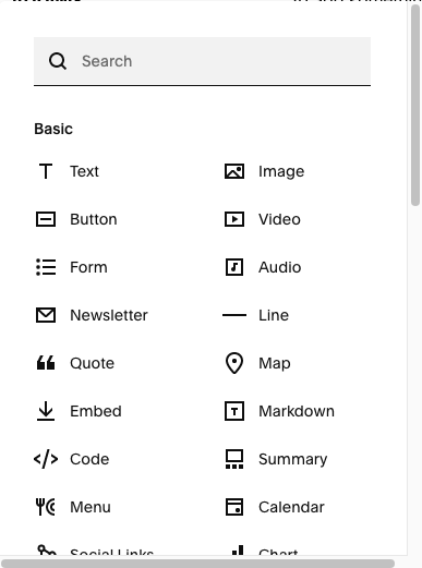 Hover over the section you want to add something to, and click “+ Add Block”. You can these items: