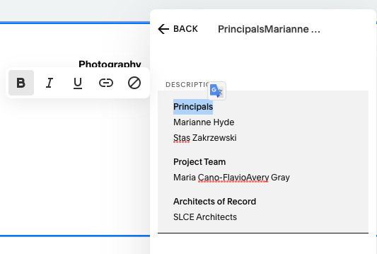 To edit, hover over the area > Edit Content. Only description is used here. With a mix of bold and regular type. And the line break command: “Shift+Return”